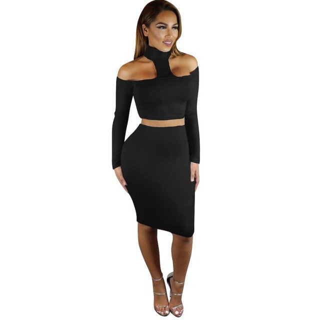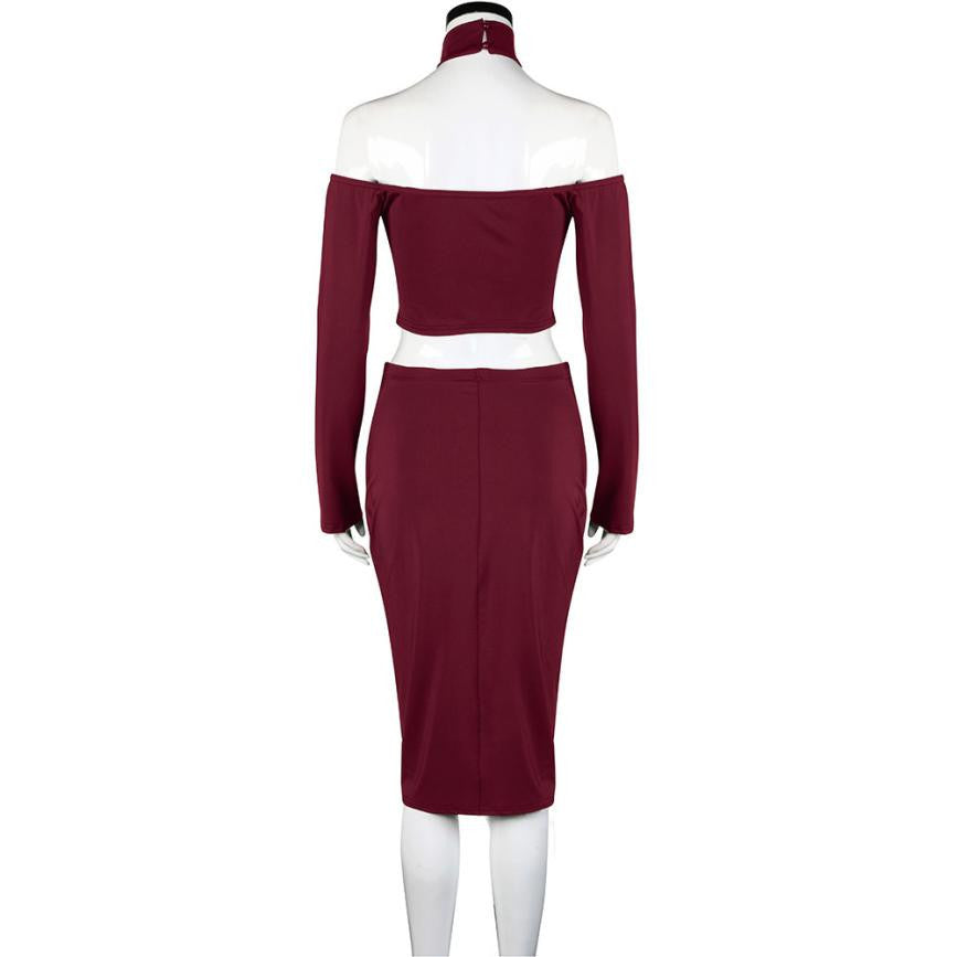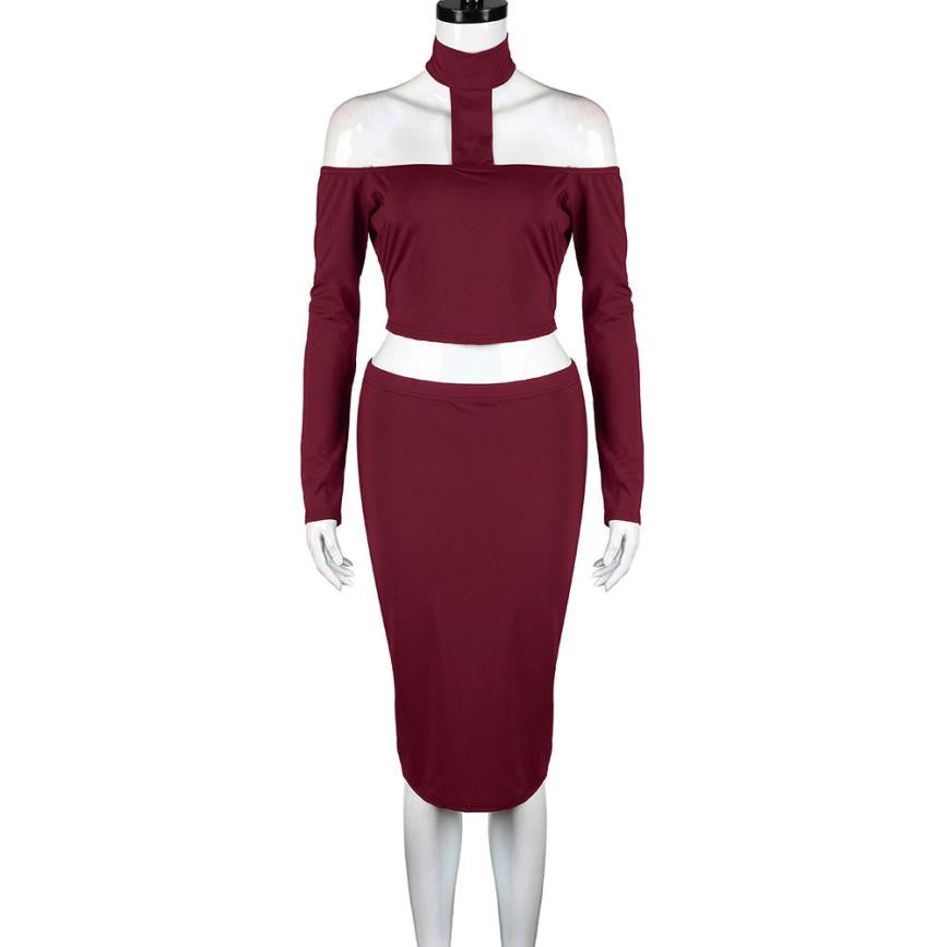 2 Pieces Set Halter Neck Womens Dress Off Shoulder Long Sleeve Knee-length Ladies Choker Wrap Bodycon Pencil Dresses #1214