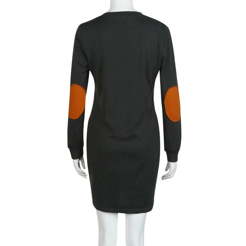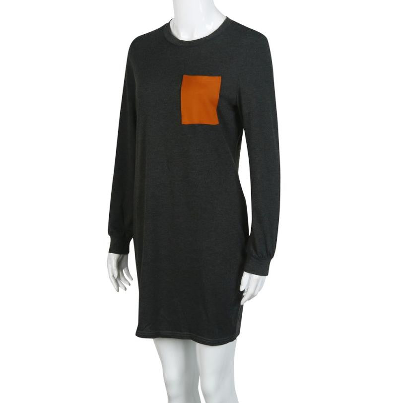 2016 Autumn Casual Dresses For Women Loose O NecK Long Sleeve Pocket Patchwork Straight Tunic Mini Dress Vestidos