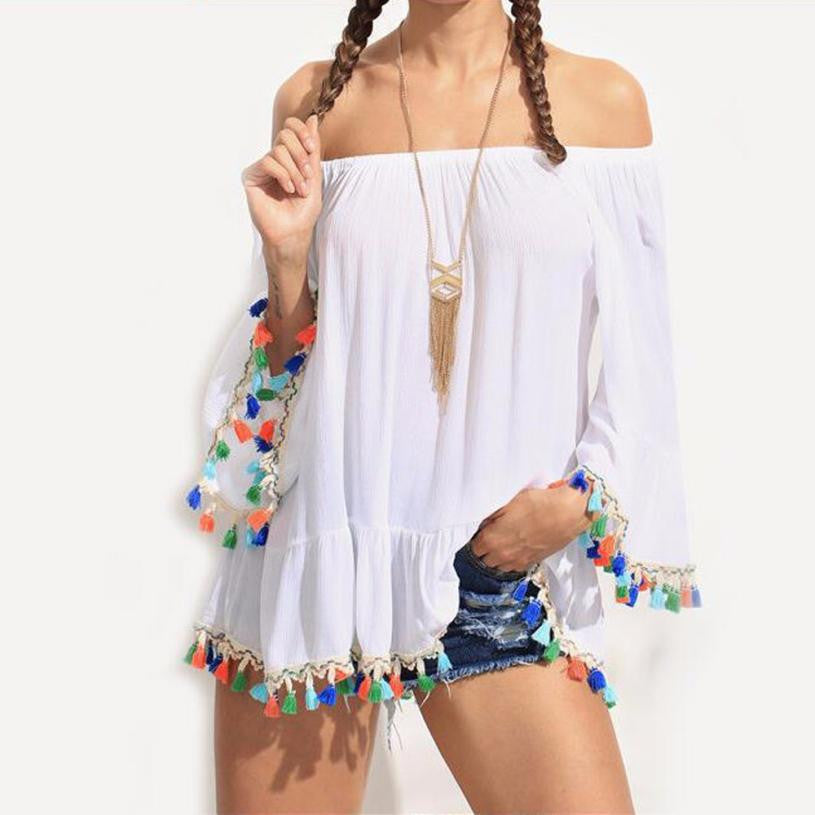 2016 Hot Sale Women Casual Tops Off Shoulder Tassel Loose Ladies Boat Neck Strapless White T Shirt Femme Women Clothes Camisetas