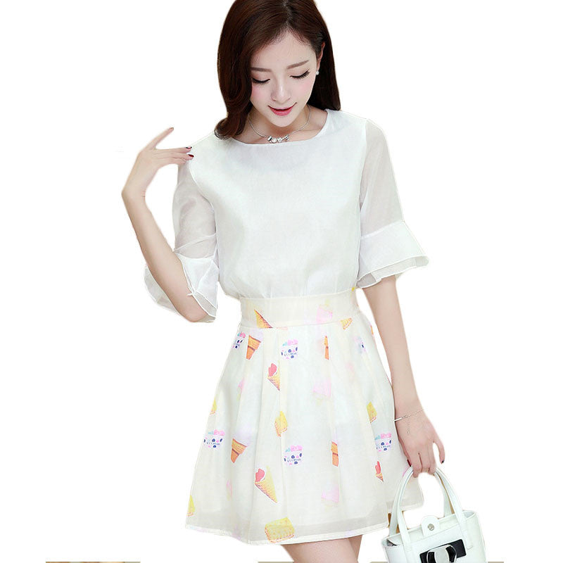 2016 New Arrival Women Floral Print Skirt Set 2 Pieces Suit O-neck Short Sleeve Chiffon t shirt Plus Size Zipper Woman 70900