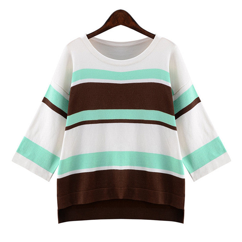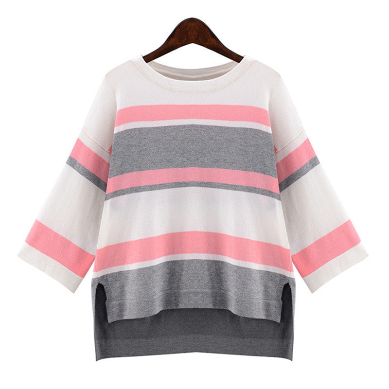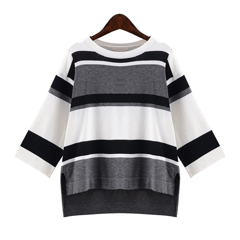 2016 New Autumn Female Knitted Sweater Plus Size Stripped Thin Knittedwear Three Quarter Sleeve O-neck Irregular Pullovers 71307