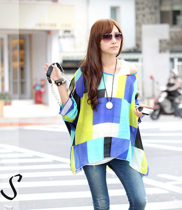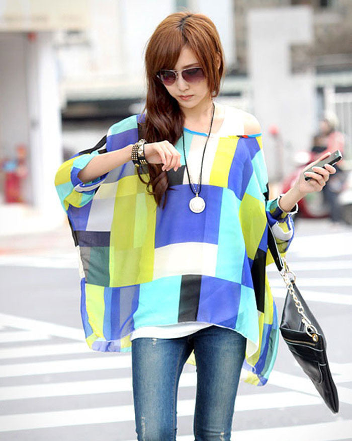 2016 New Batwing Sleeve Shirt&Blouse Fashion Women Chiffon Shirts Bohemian Plaid Print Half Sleeve Oversized Blouse Tops Shirt