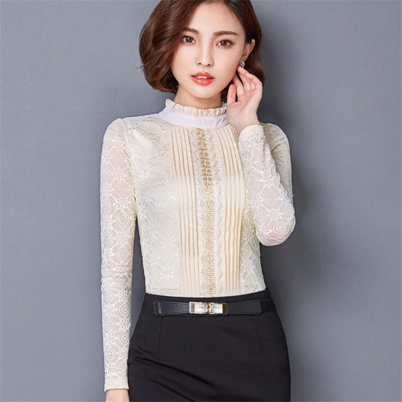Gender: WomenDecoration: LaceClothing Length: RegularSleeve Style: RegularPattern Type: SolidStyle: FashionFabric Type: ChiffonMaterial: Nylon,Acetate,AcrylicCollar: StandSleeve Length: FullLace Blouse: Plus Size S-2XL Blouse