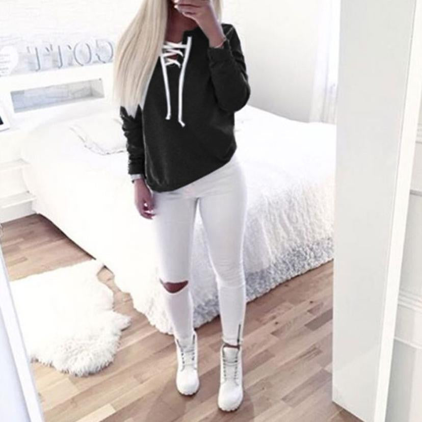 2016 New Fashion t shirt women Lacing Up cotton Solid Autumn Long Sleeve V Neck t-shirt women clothes tee shirt femme camisetas
