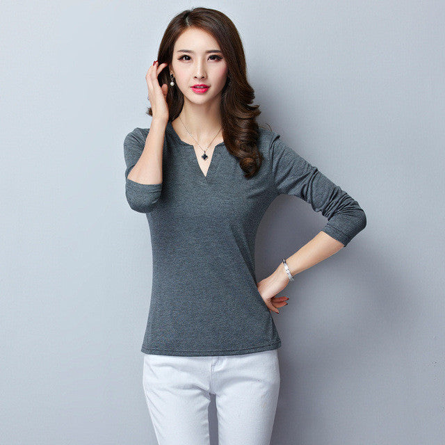 2016 New Fashion Women clothing T shirts V-neck t-shirt Women Top Full Sleeve M-5XL Tee 71708