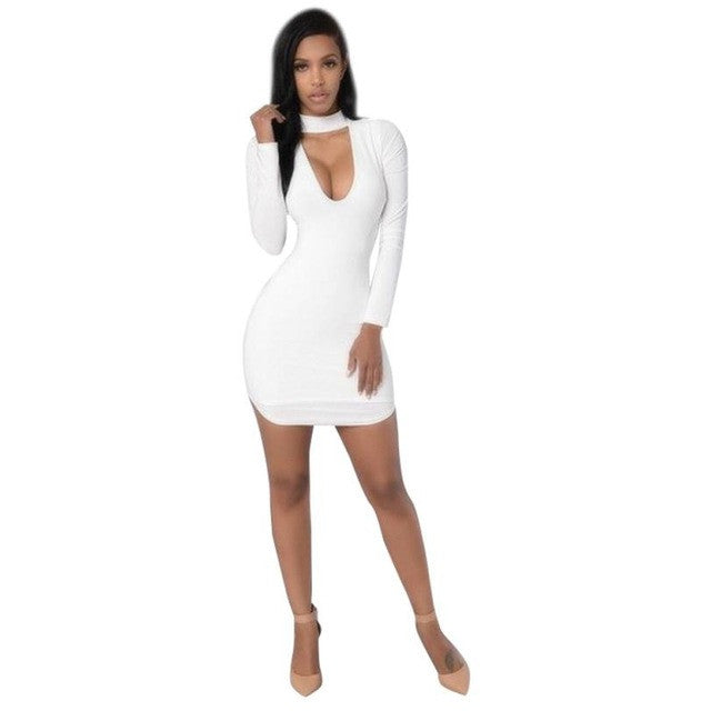 2016 New Fashion Women Club Wear Bodycon Autumn Dress Long Sleeve v Neck Sexy Mini Dress Black White Pink Solid Sheath Dress