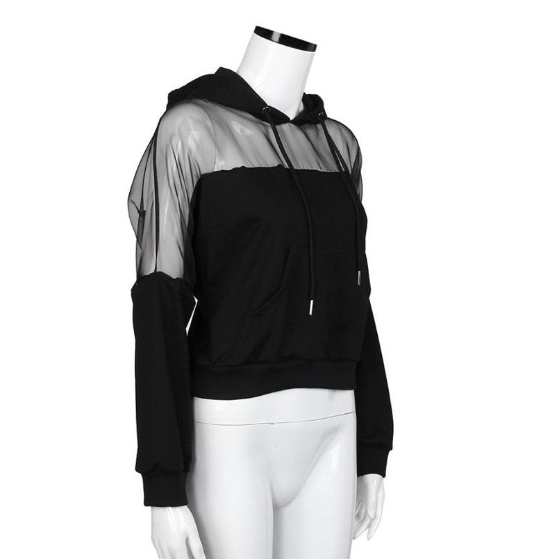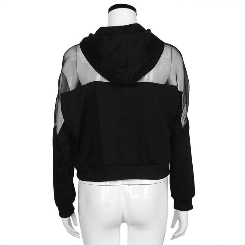 2016 New Fashion Women Sexy Lace Splice Shoulder Transparent Autumn Tops Long Sleeved Hooded Casual Short Tee Shirts Femme Black