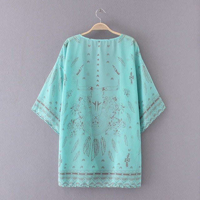 2016 New Fashion Women Shirts Tops Print Ladeis Three Quarter blouses Long Chiffon Kimono Beachwear Cover Up Women Clothing SY