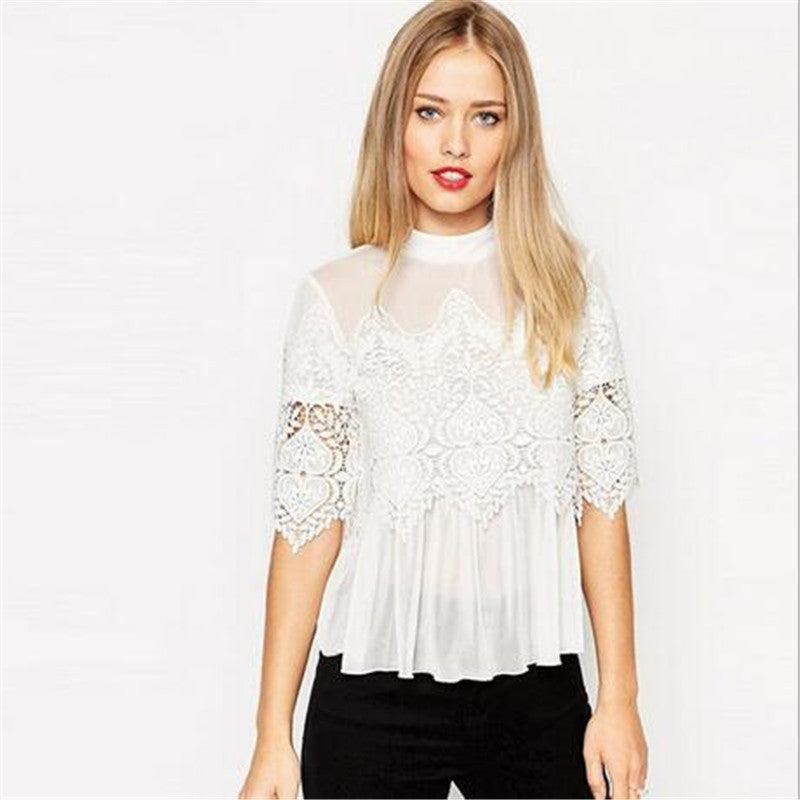 2016 New Hot Sale Women Blouse Stand 3/4 Tee Shirt Chiffon Casual Blouses Lace Fashion Plus Size Blusas 70656