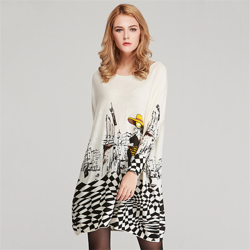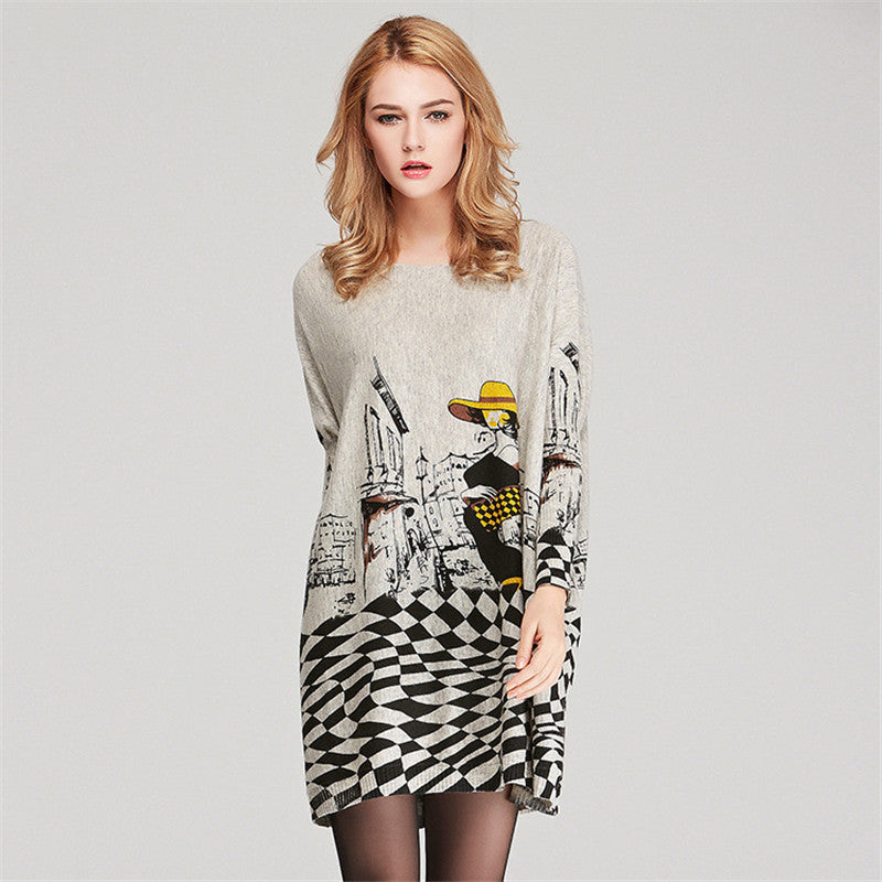 2016 New Sweater Women Plus Size Pullover Medium-long Carton Print Woman O-neck Full Sleeve Loose Sweater 71587