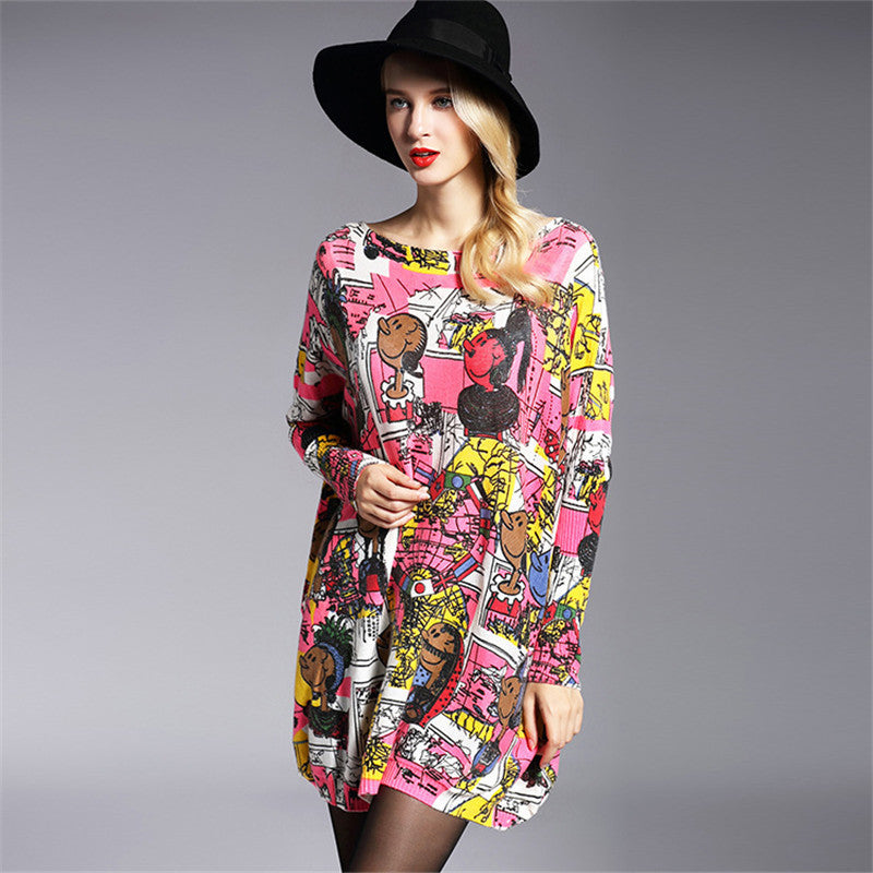 2016 New Sweater Women Plus Size Pullover Medium-long Carton Print Woman O-neck Full Sleeve Loose Sweater 71756