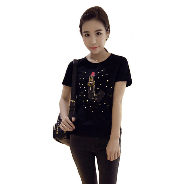 2016 New Women Print T Shirts Loose Short Sleeve T-shirt Lip Stick Beading tshirt Girl Casual Tops 70963