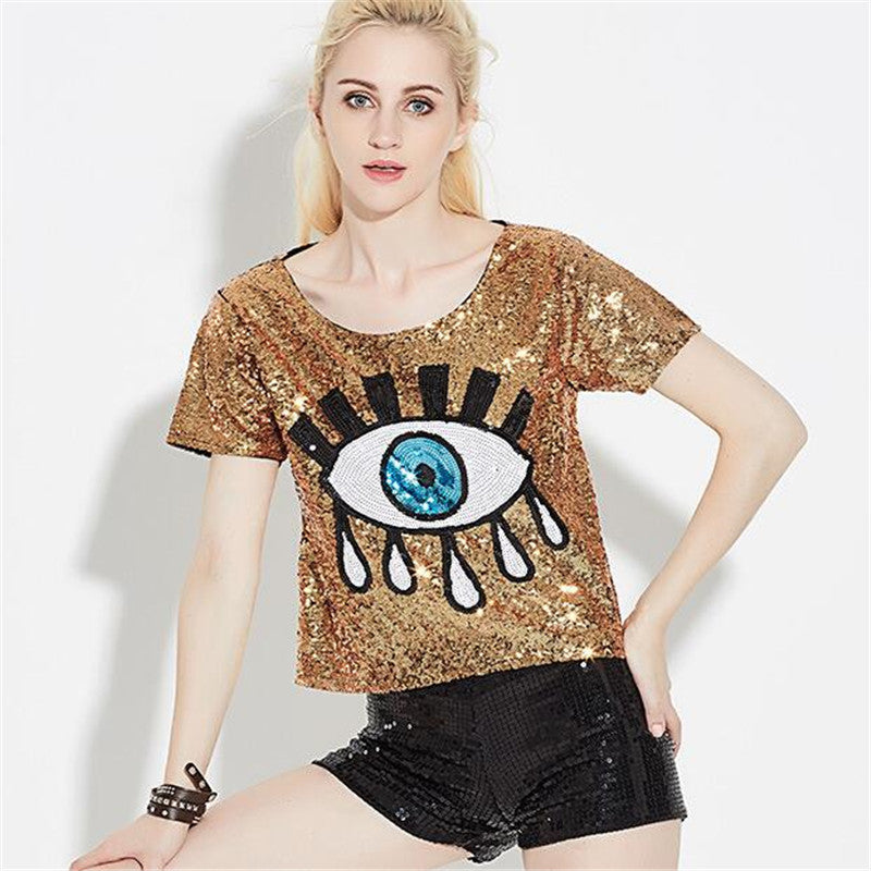 2016 New Women T shirts Eye Print t-shirt Woman O-neck Crop Top Short Sleeve Sequined Bling Short Female Plus Size t shirt 72131