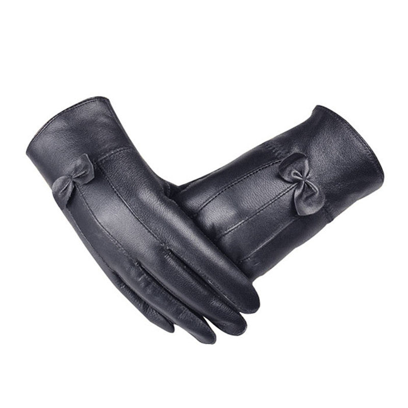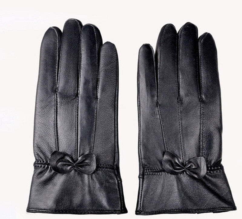 2016 Winter Women Girl Luxurious PU Leather Winter Super Warm Gloves Cashmere Bow Women Warm Out Work Gloves Gants Homme#697