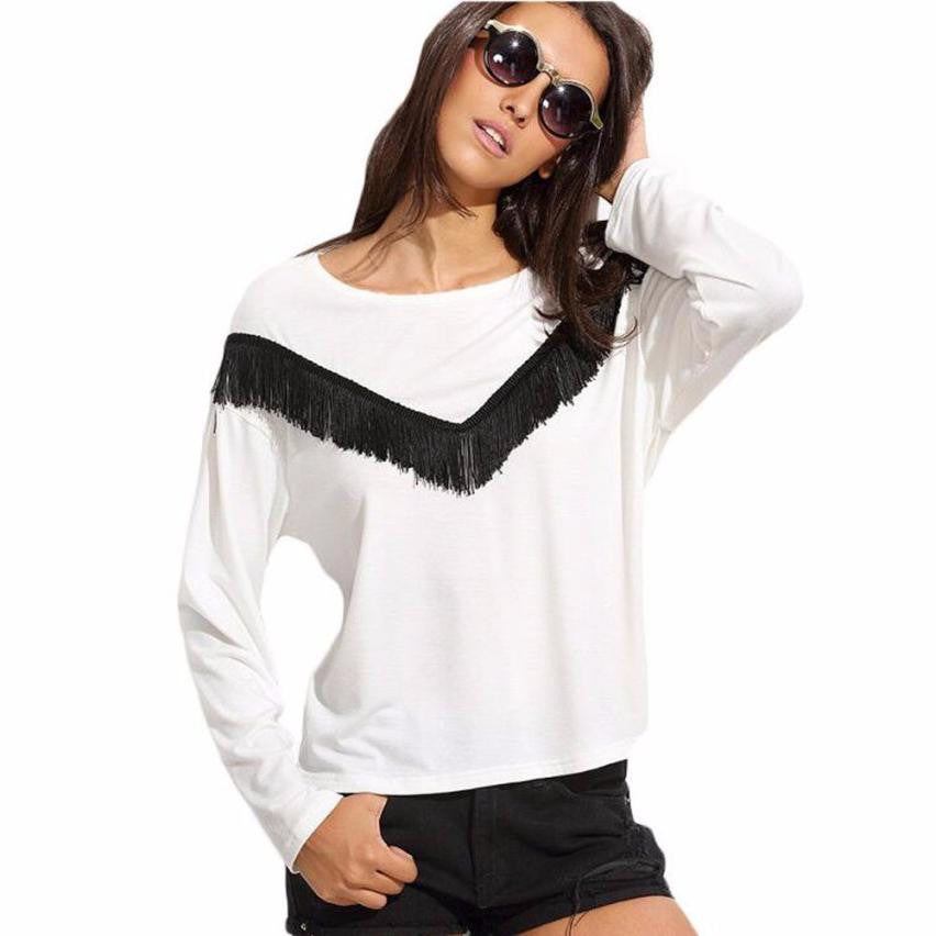 2016 Women Tops Casual Long Sleeve T shirt Tassel Long Sleeved O Neck Shirt Tops T-shirt Feminina Autumn Spring